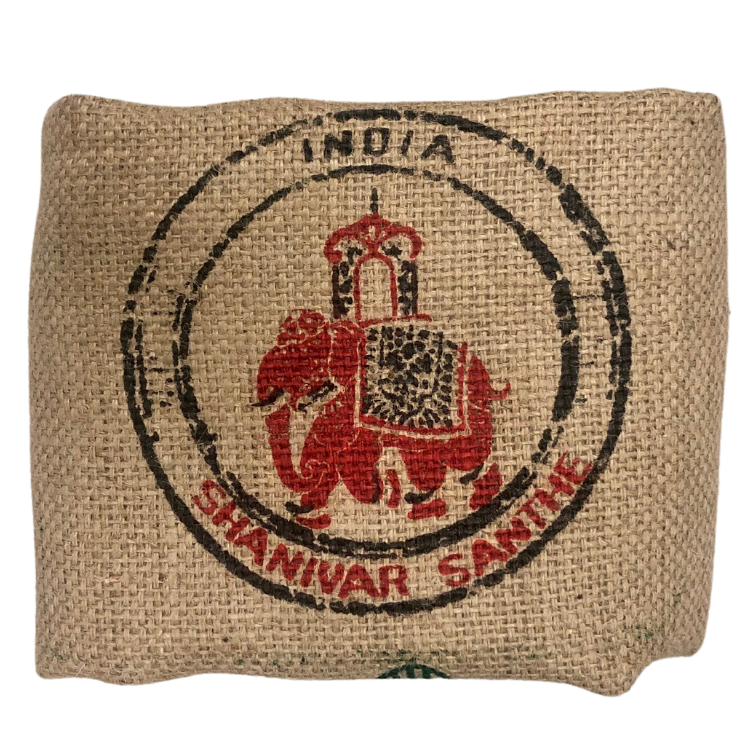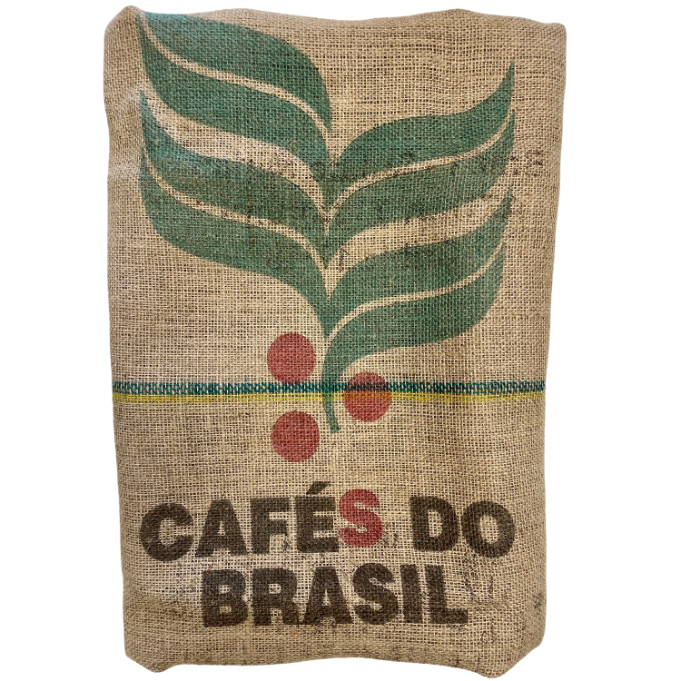 Sac de café du Brésil en toile de jute et fibre synthétique.